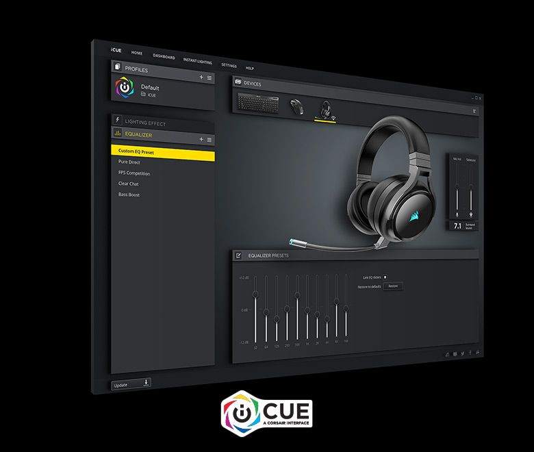 Программное обеспечение CORSAIR iCUE предлагает готовые звуковые профили, пользовательские настройки эквалайзера, реалистичный объемный звук 7.1 и настройки звука микрофона.