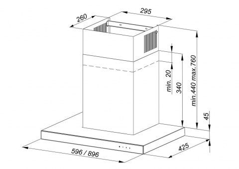 Благодаря перевернутой Т-образной форме вытяжка максимально закрывает варочную поверхность. Устройство оснащено пультом дистанционного управления, что облегчает управление. Вытяжка может работать как вытяжка, подключаемая к дымоходу, или как абсорбер в замкнутом контуре с дополнительным угольным фильтром.