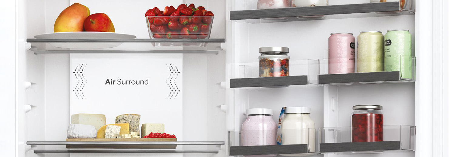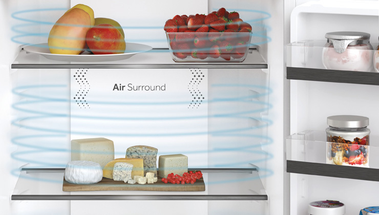 Технология Air Surround обеспечивает мягкую и мягкую циркуляцию воздуха внутри холодильника. Благодаря специальным боковым выходам система равномерно распределяет холодный воздух, избегая при этом прямого воздействия на хранящиеся продукты, что не приводит к их потере веса и высыханию. Именно поэтому Haier Air Surround сохраняет вкус, консистенцию и сочность еды до 99% через 7 дней после помещения ее в холодильник.