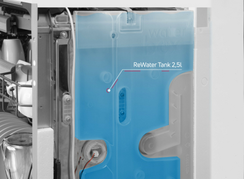 Ваша посудомоечная машина расходует на 2,5 литра меньше воды за один цикл! В некоторых программах вода собирается в специальный резервуар, который повторно используется в следующем цикле. Продуманное решение также обеспечивает гигиену. Если мы не будем пользоваться посудомоечной машиной в течение четырех дней, бак опустошится автоматически. Комфортно, экологично и экономично!