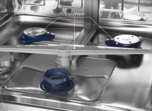 Три душа в нижней корзине точно распределяют воду, интенсивно и идеально отмывая самую грязную посуду.