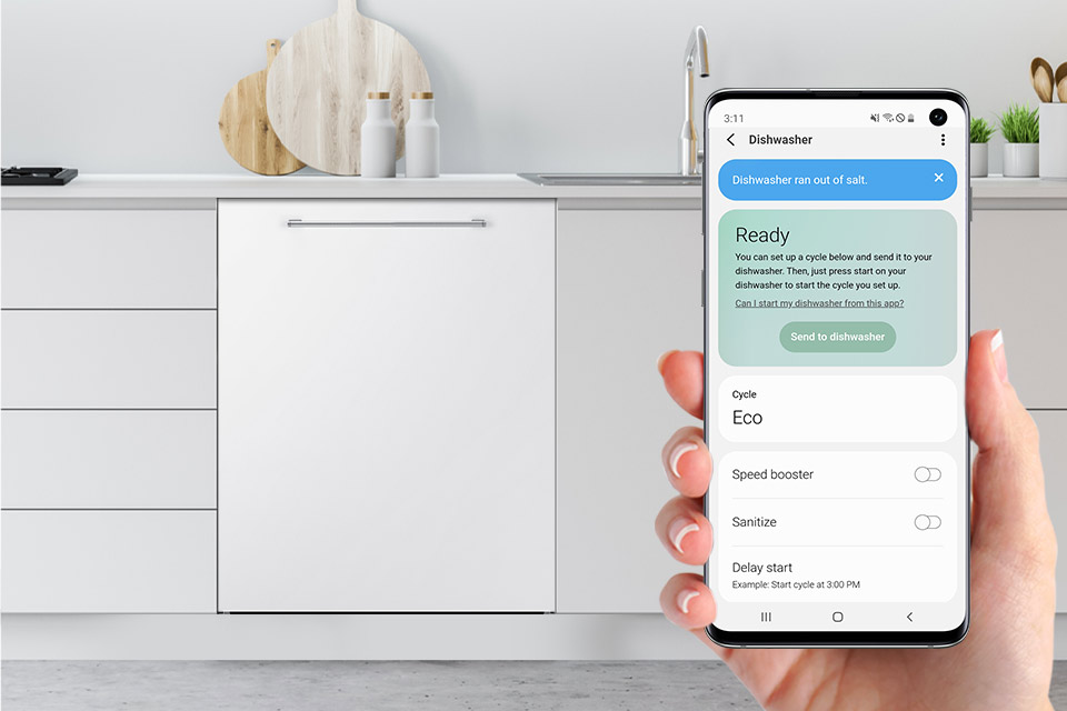Модуль Wi-Fi позволяет удаленно управлять вашим устройством. Он проинформирует вас о готовности посудомоечной машины к работе и позволит выбрать подходящую программу и функцию. Чтобы легко выбрать нужные настройки, используйте приложение SmartThings, которое можно скачать в Play Store или App Store.