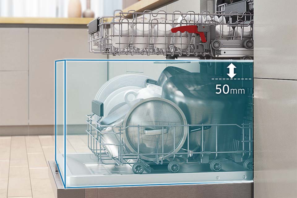 Отрегулируйте верхнюю корзину посудомоечной машины вверх или вниз на расстояние до 5 см. Это решение особенно полезно, когда вы пытаетесь найти место в посудомоечной машине для посуды большего размера или нестандартной формы.