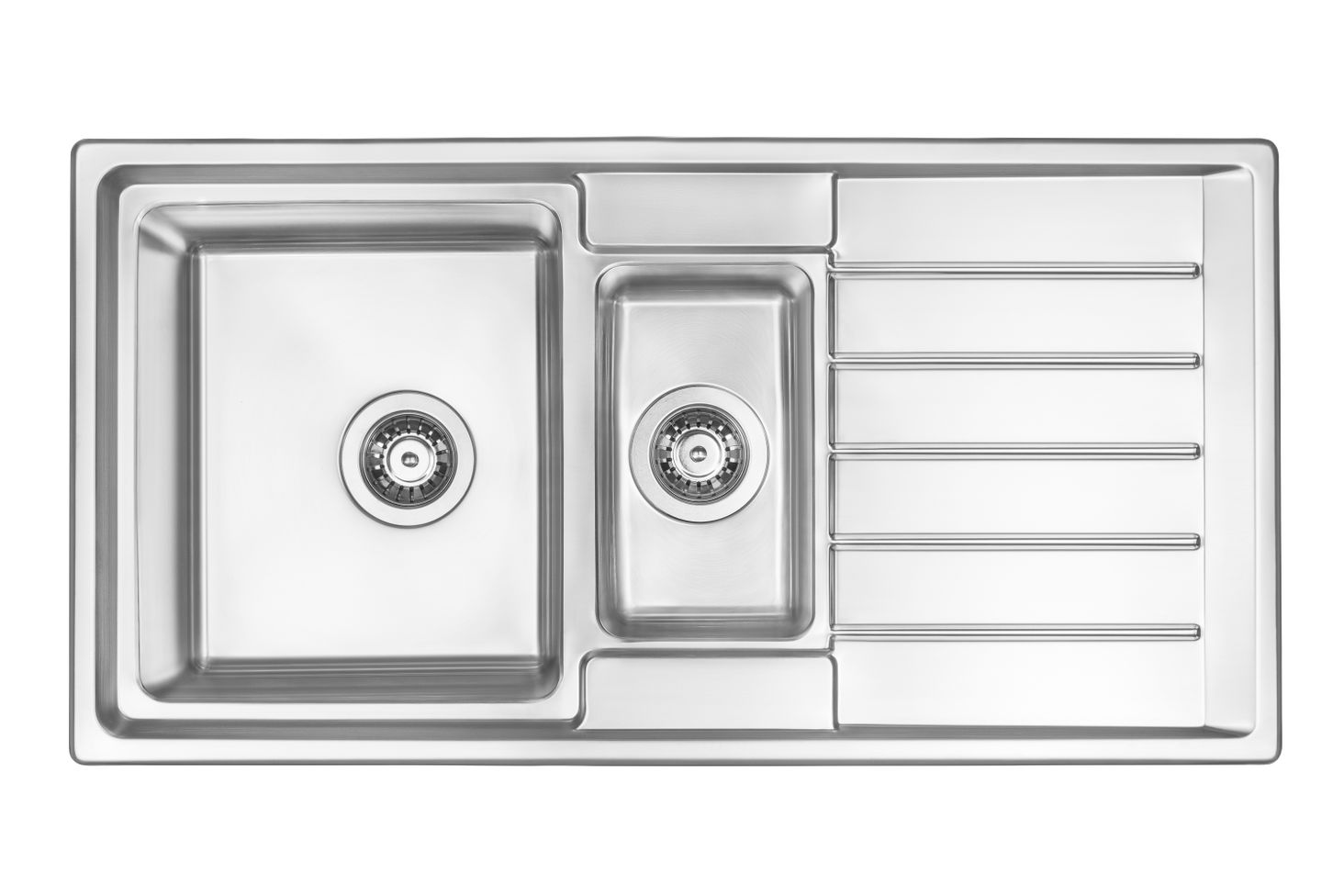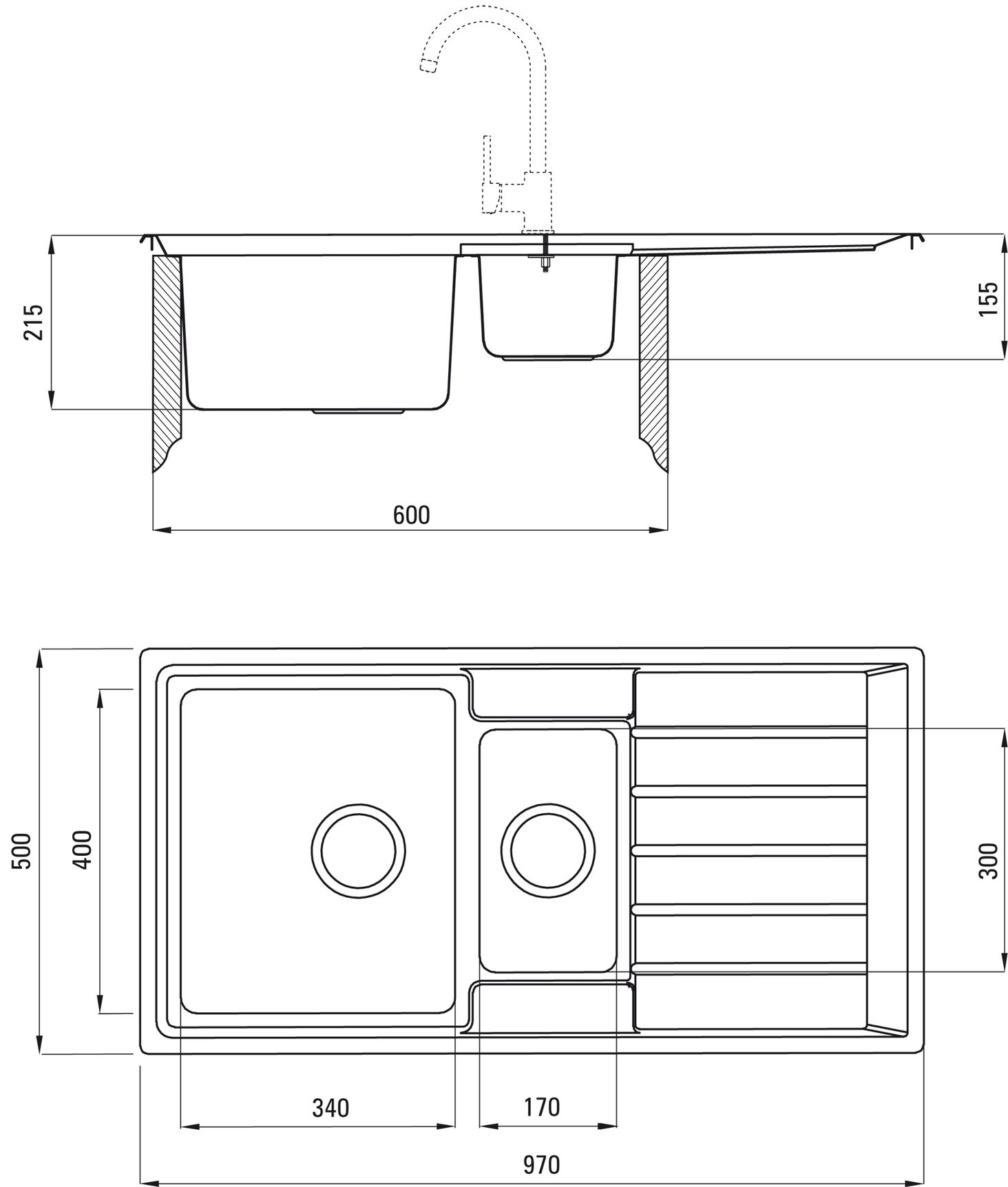 Длина: 970 мм Ширина: 500 мм Глубина чаши: 215 мм Шкаф: 600 мм Слив: 3,5 дюйма Модель мойки: 1,5 чаши Толщина стали: 1000 мкм