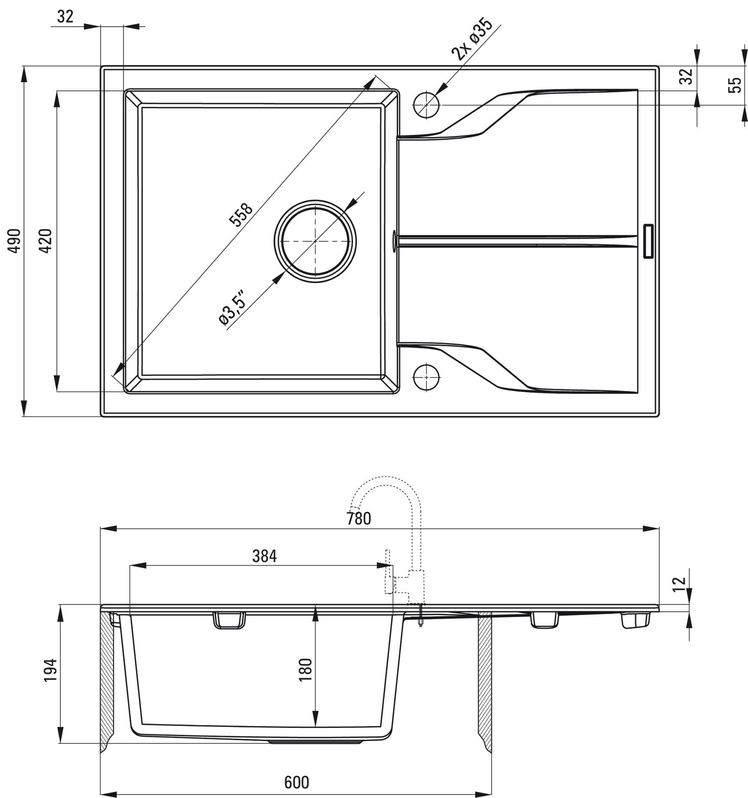 Длина: 780 ммШирина: 490 ммГлубина: 180 ммДля шкафа: 600 ммСлив: 3,5 дюйма Модель раковины: 1 чашаАвтоматическая пробка: Да