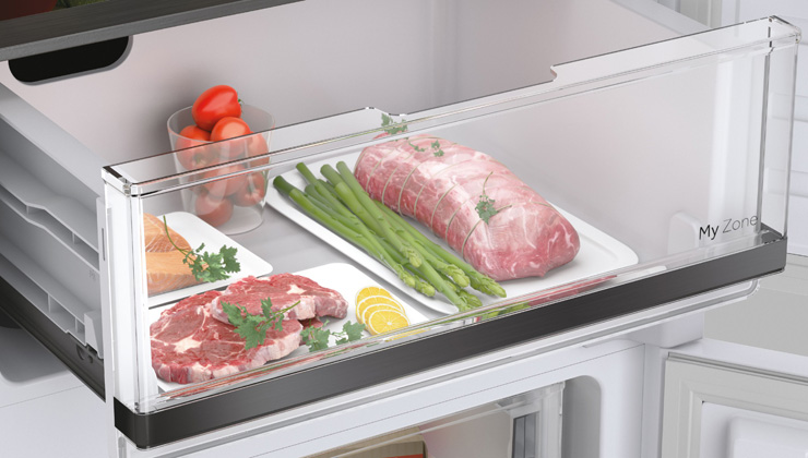 Функция MyZone позволяет легко регулировать температуру (от 0°С до +2°С) в ящике в зависимости от того, какие продукты будут там храниться. Доступные опции включают настройки для хранения овощей и фруктов, мяса и сыра, продуктов для размораживания, морепродуктов и продуктов для быстрого охлаждения.
