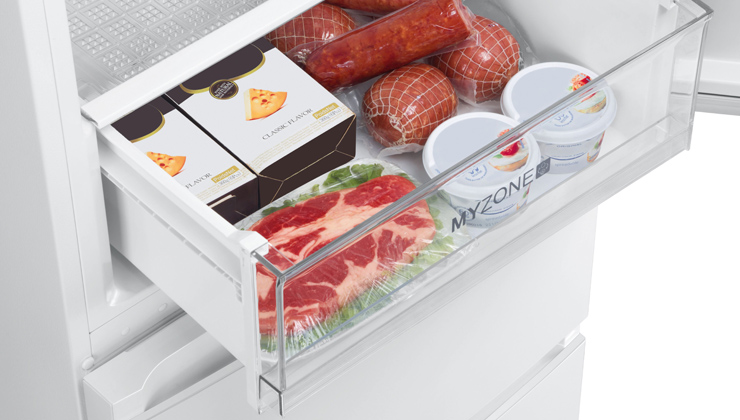 Функция MyZone позволяет легко регулировать температуру (от -3°С до +5°С) в зависимости от того, какие продукты питания будут там храниться. Доступные опции включают настройки для хранения овощей и фруктов, мяса и сыра, продуктов для размораживания, морепродуктов и продуктов для быстрого охлаждения.