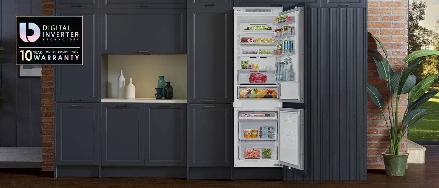 Встраиваемый холодильник Samsung оснащен функциональными решениями, которые облегчат ваше повседневное использование. В него легко поместятся большие блюда с едой, а также высокие бутылки или картонные коробки. У вас будет свободный доступ к продуктам, а если вы забудете закрыть дверцу, устройство напомнит вам об этом.