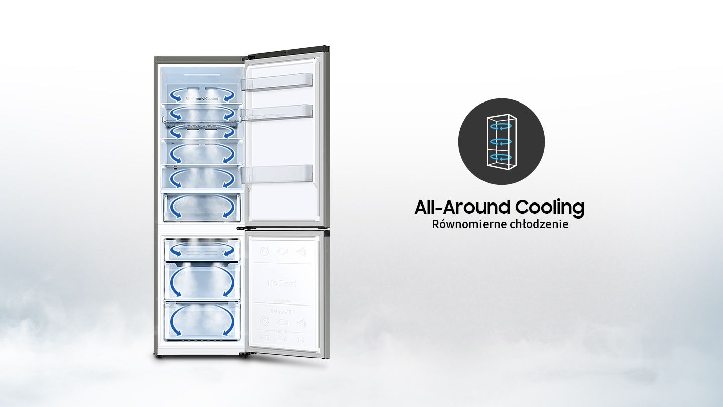 Система All-Around Cooling мягко и равномерно распределяет прохладный воздух по всему устройству. Новая линейка холодильников Samsung обеспечивает более эффективное и простое охлаждение там, где этого требуют продукты питания. Точно, быстро и в каждом уголке вашего холодильника.