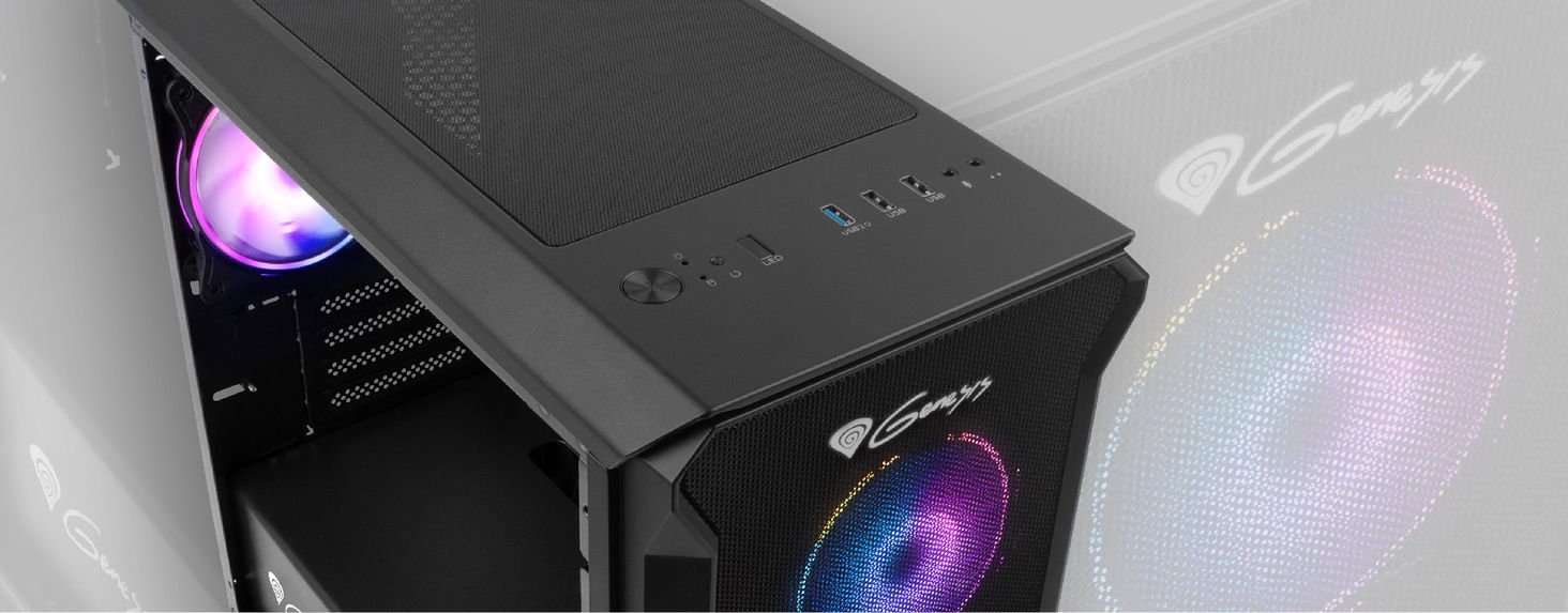 В верхней части корпуса расположены целых 3 порта USB, включая USB 3.0. Для вашего удобства мы также разместили там два гнезда, чтобы вы могли подключить наушники или микрофон как можно ближе. Кроме того, есть кнопка, отвечающая за изменение режимов великолепного ARGB-освещения, чтобы оно выглядело так, как вы хотите в данный момент.