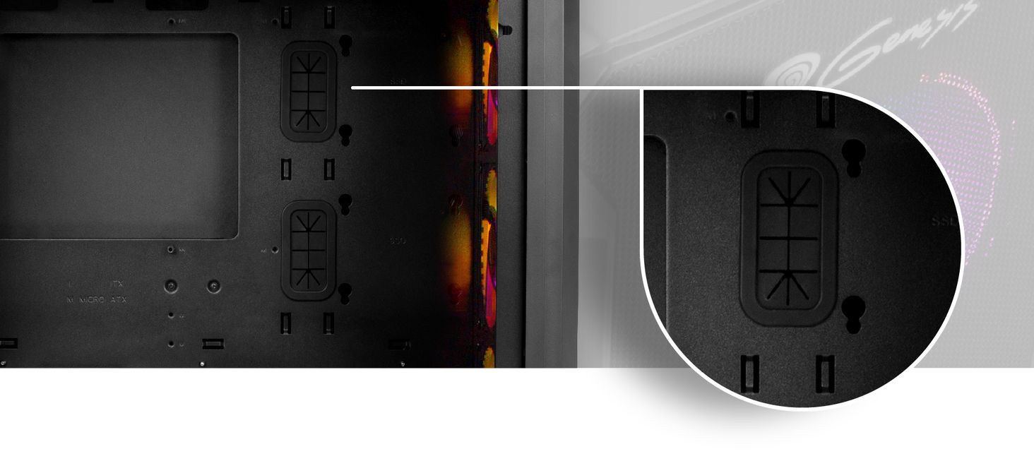 Irid 503 ARGB обеспечивает максимальный комфорт при использовании корпуса, поскольку мы упростили установку накопителей благодаря использованию простой технологии «slot-in». Это простой механизм, который позволяет собирать и разбирать корзину для SSD и HDD без повторного использования инструментов.