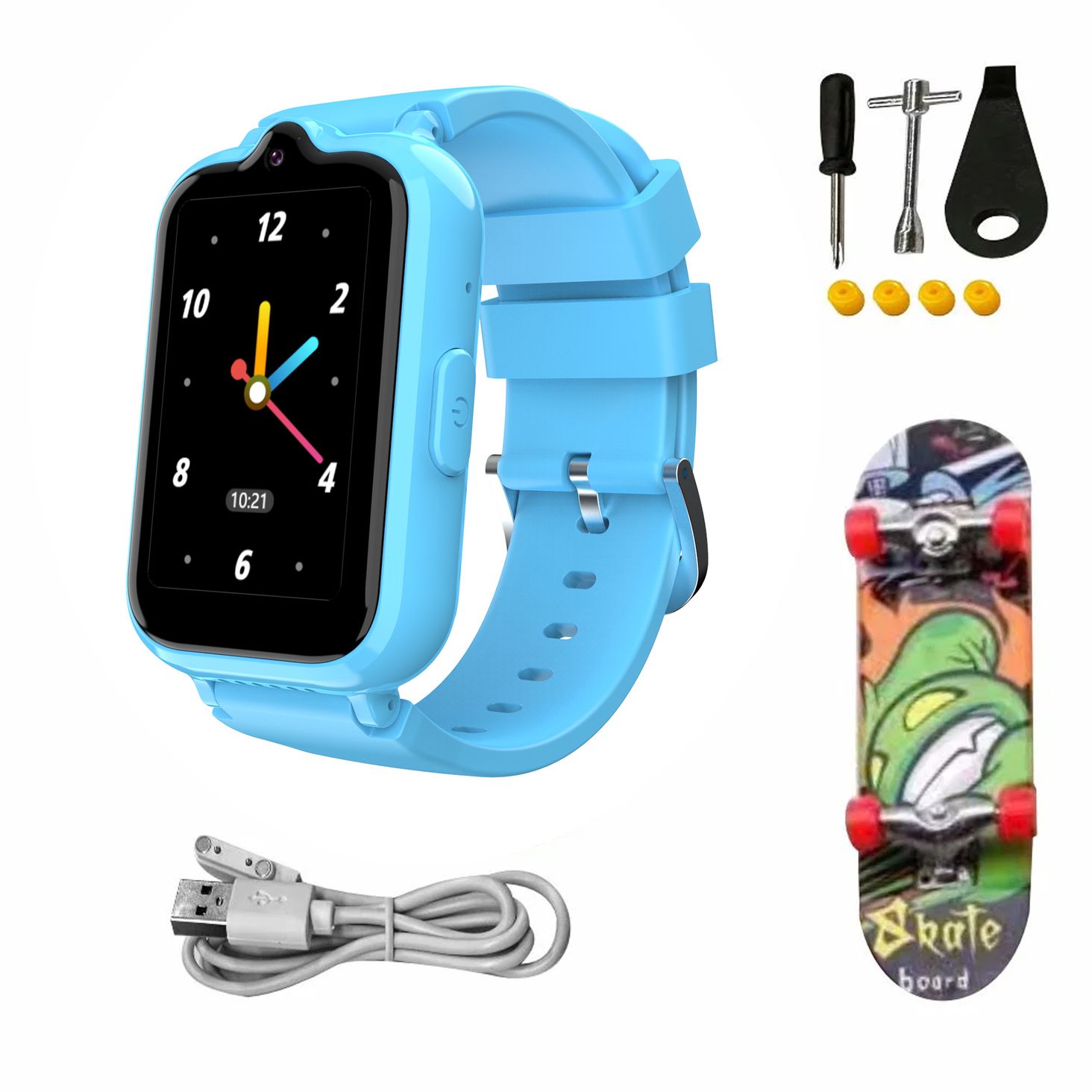 В комплект входит мини-скейтборд, который доставляет малышам дополнительное удовольствие и удовольствие. Эта игрушка позволяет детям активно развлекаться и развивать моторику, что создает дополнительные возможности для радостной игры. Это прекрасное дополнение, которое делает умные часы не только практичным инструментом, но и источником радости и творческого развлечения для детей.