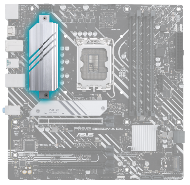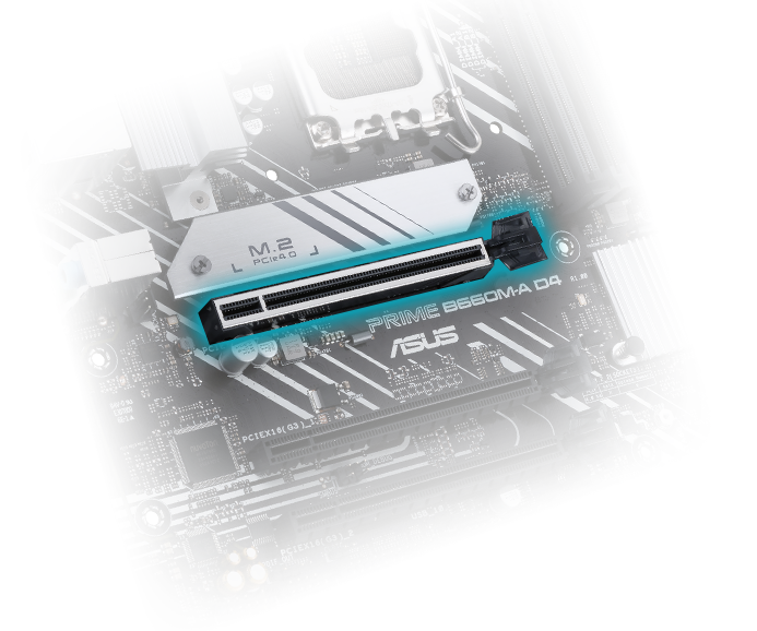Материнская плата Prime B660M-A D4 имеет в общей сложности два слота M.2, которые поддерживают передачу данных со скоростью до 64 Гбит/с через PCIe® 4.0, что обеспечивает более быструю загрузку и загрузку с системного диска или мультимедийных приложений.