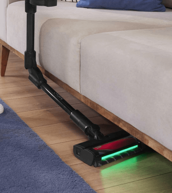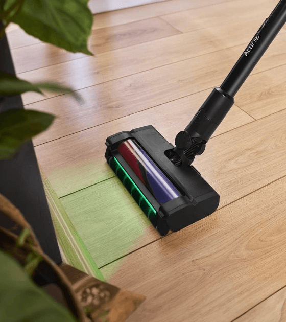 Угловая трубка ActiFlex™ позволяет легко чистить под мебелью, не наклоняясь, а щетка со светодиодами позволяет увидеть мельчайшие частицы пыли в плохо освещенных местах.