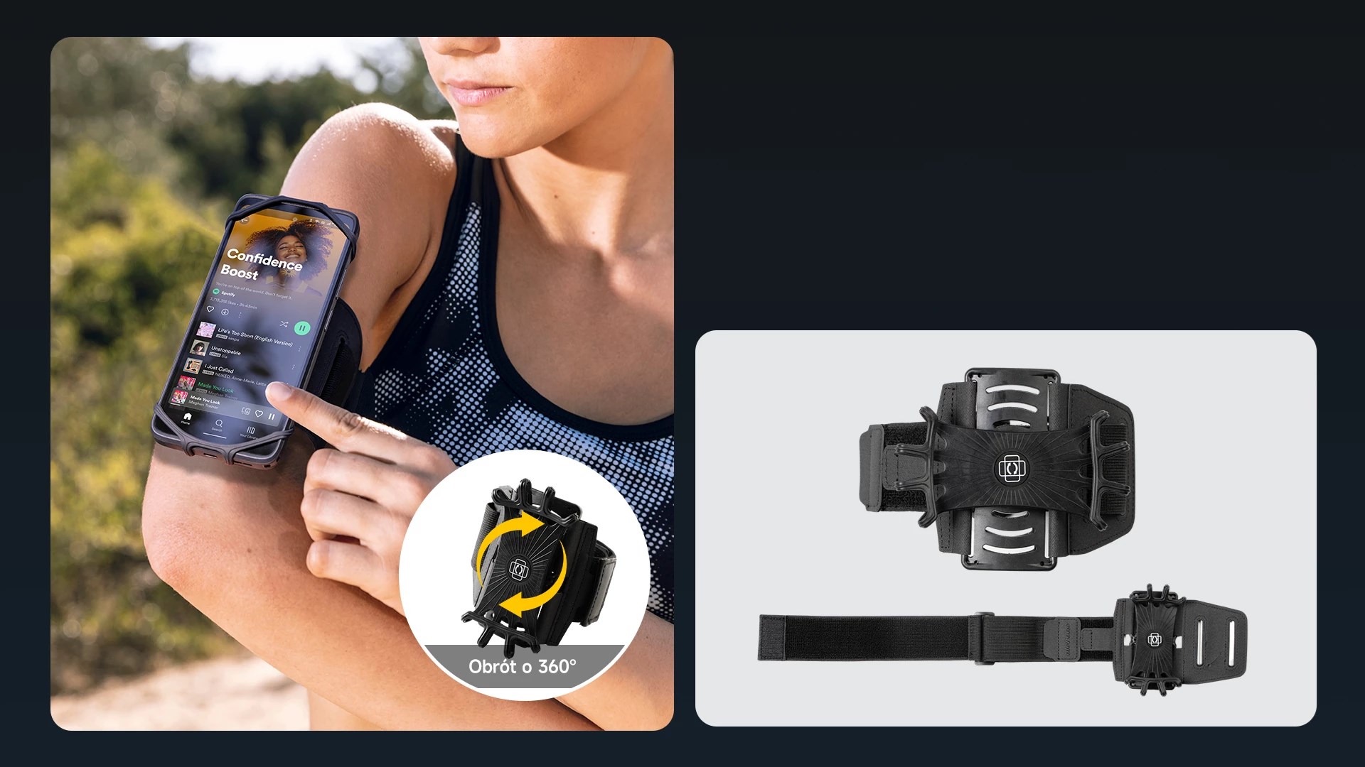 Универсальный держатель для телефонов 4″-6,5″, с возможностью поворота экрана на 360 градусов и карманами для ключей и наушников. Размер ремешка можно свободно регулировать благодаря дополнительному ремешку. Идеально подходит для бега, фитнеса, пеших прогулок и езды на велосипеде.