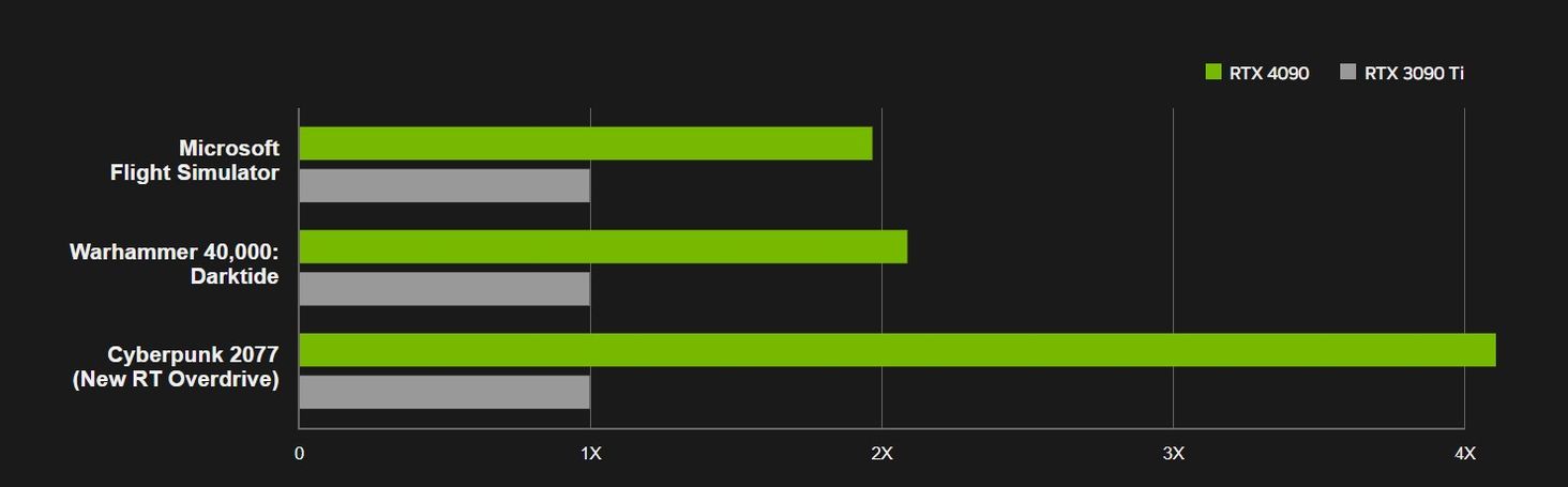 Ниже приведен график, показывающий производительность RTX 4090 по сравнению с ее предшественницей RTX 3090 Ti