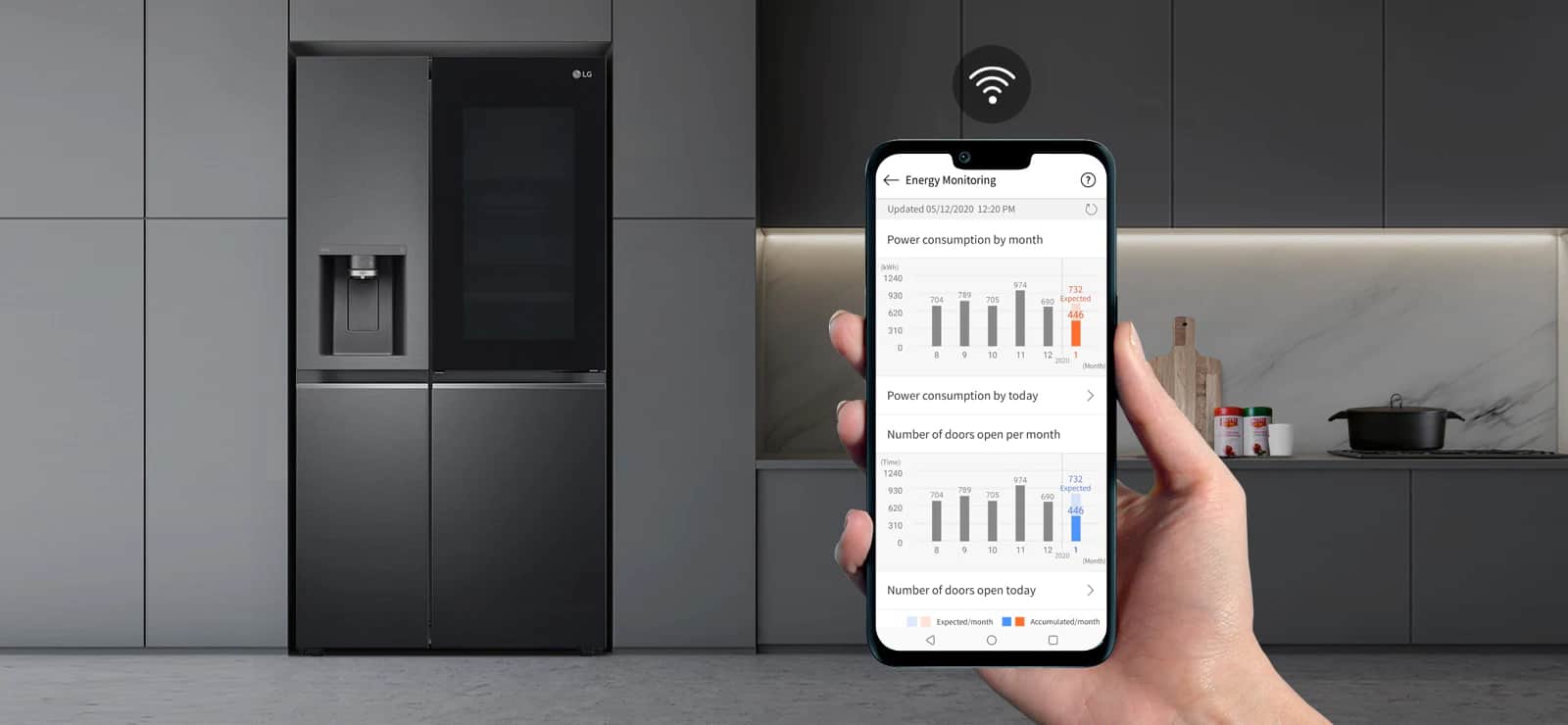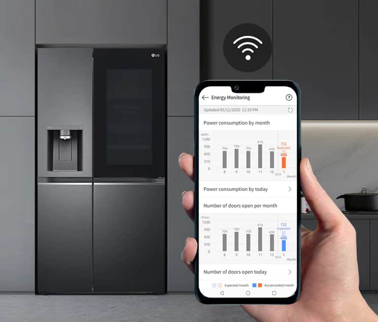 Приложение LG ThinQ™ постоянно контролирует состояние холодильника. Это позволяет вам легко контролировать потребление энергии и эффективно выполнять ежедневные работы по техническому обслуживанию.