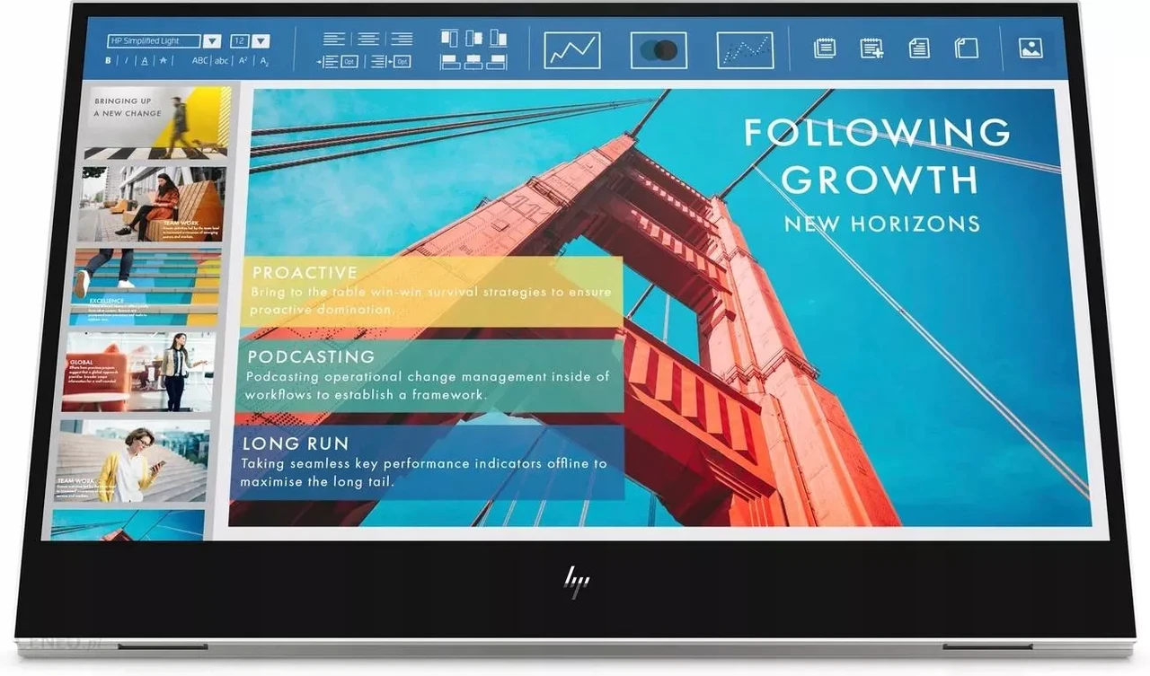 Мобільний монітор, готовий працювати за будь-якого освітлення. Подвоїть вашу продуктивність із портативним монітором HP E14 G4. Вийміть монітор із м’якого футляра, помістіть його на складну підставку та під’єднайте за допомогою одного кабелю USB-C. Насолоджуйтеся ідеальним і дуже яскравим зображенням як у приміщенні, так і на вулиці.