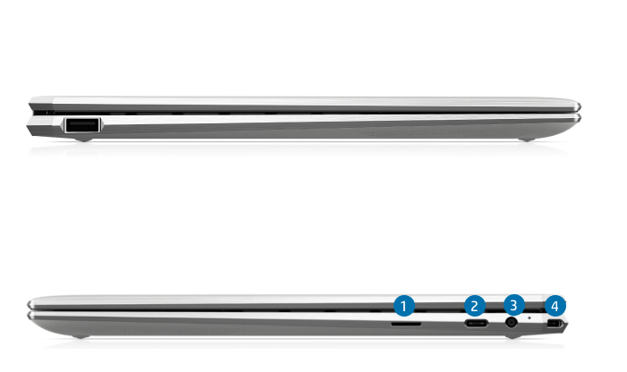 Порти:1. Зчитувач карт SD_x000D_ 2. Thunderbolt™ 4 з USB4™ Type-C®_x000D_ 3. Потужність_x000D_ 4. Thunderbolt™ 4 із USB4™ Type-C®