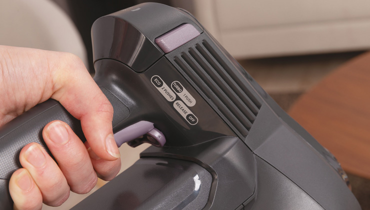 Ергономічна ручка пилососа оснащена кнопкою All In One, яка дозволяє швидко і зручно змінювати налаштування під час роботи пристрою. Увімкніть або вимкніть пилосос, збільште або зменшіть рівень потужності, перемикаючись між режимами Turbo та Eco, і відпустіть фіксатор ручки, щоб висунути щілинний інструмент.
