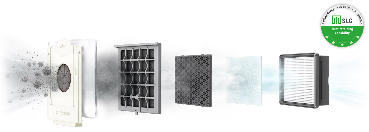 Багатошарова система фільтрації затримує до 99,999% мікрочастинок пилу та алергенів*. Великі частинки бруду потрапляють у мішок для бруду, фільтр перед двигуном вловлює менші частинки пилу. Далі повітря пропускається через вугільний фільтр, який видаляє неприємні запахи, і через шумопоглинаючий фільтр. Нарешті, пиловий фільтр вловлює найдрібніші частинки пилу та алергенів розміром 0,3 ~ 10 мкм**.