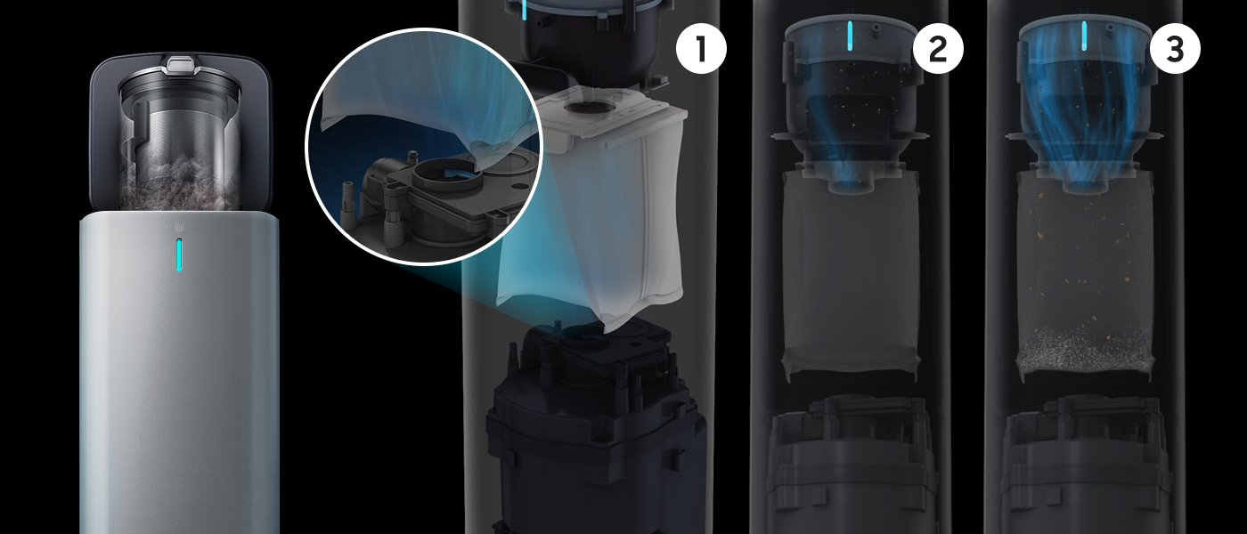 Пил і бруд автоматично висипаються в мішок для бруду.