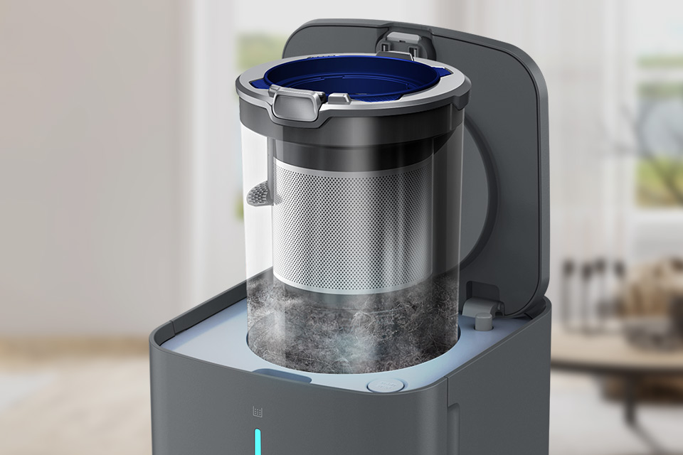 Клінінгова станція має мінімалістичний дизайн, який ідеально впишеться в будь-який інтер'єр. Тонкий дизайн із елегантним теплим сріблястим відтінком. Прилад простий у використанні. На передній панелі пристрою є світлодіод. Коли він стане червоним, замініть мішок для бруду.
