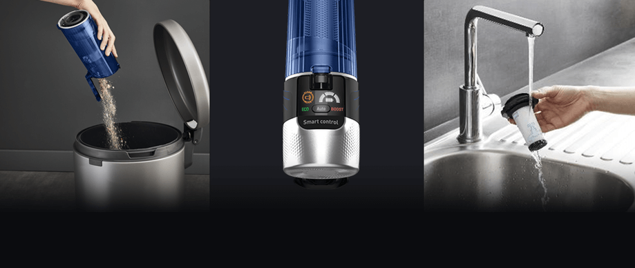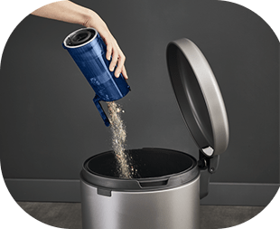 Ємкий резервуар об'ємом 0,44 л дозволяє пилососити протягом тривалого часу. Ви можете легко спорожнити його двома способами - відкривши кришку знизу або вийнявши фільтр і сепаратор зверху. Якщо фільтр потребує очищення, про це нагадає значок фільтра на дисплеї.