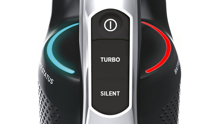 Дуже проста у використанні, зручна і функціональна - це нова сенсорна панель управління в пилососі H-FREE 500. Одним рухом великого пальця ви зможете вмикати і вимикати пристрій і змінювати режим його роботи, а також кольорові світлодіоди з боків інформуватимуть вас про поточний рівень заряду та стан батареї.