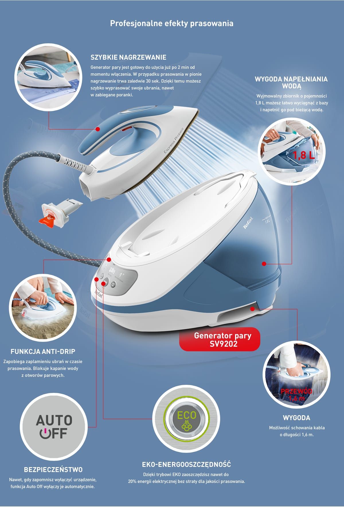 Безпечне та легке прасування Завдяки технології No Setting генератор вибирає оптимальну комбінацію пари та температури, тож ви можете безпечно прасувати будь-яку тканину, не змінюючи налаштувань. З генератором Tefal SV9202 ви можете прасувати навіть шовкові тканини, не турбуючись про їх пошкодження.