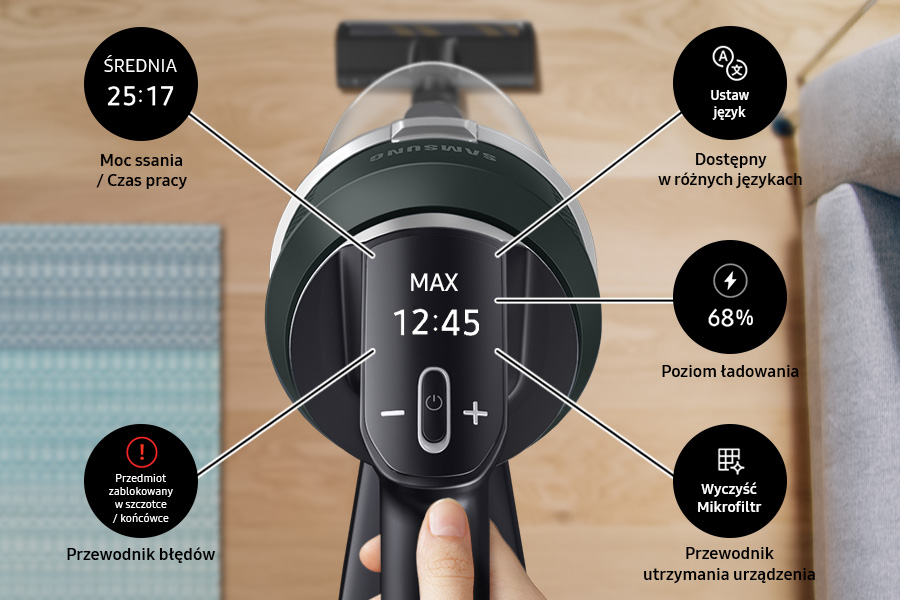 Дисплей допоможе вам стежити за станом пилососа. Завдяки цьому ви можете перевірити, серед іншого: рівень заряду батареї та час роботи, що залишився, а також ви будете проінформовані про будь-які помилки та проблеми, такі як засмічений фільтр або заблокований потік повітря. Повідомлення на дисплеї пилососа також відображаються польською мовою.