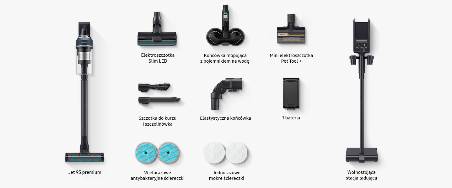 Разом із пилососом преміум-класу Jet 95 в комплект входить: автономна зарядна станція, тонка світлодіодна електрична щітка, міні-інструмент для домашніх тварин + електрична щітка для видалення шерсті з диванів, щітка для пилу з висувною м’якою щетиною, головка для миття посуду з контейнером для води, багаторазові антибактеріальні серветки та одноразові вологі серветки, щілинний інструмент і гнучкий наконечник для пилососу у важкодоступних місцях. Додатково в набір входять: батарея, що забезпечує очищення до 60 хвилин⁹