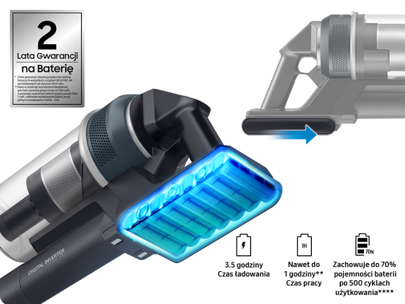 На двигун пилососа Samsung Jet 95 преміум-класу поширюється 10-річна гарантія виробника⁷. Батареї покриваються окремо гарантія терміном на 2 роки¹². Деталі гарантії можна переглянути на сайті samsung.com/pl/support/warranty/.