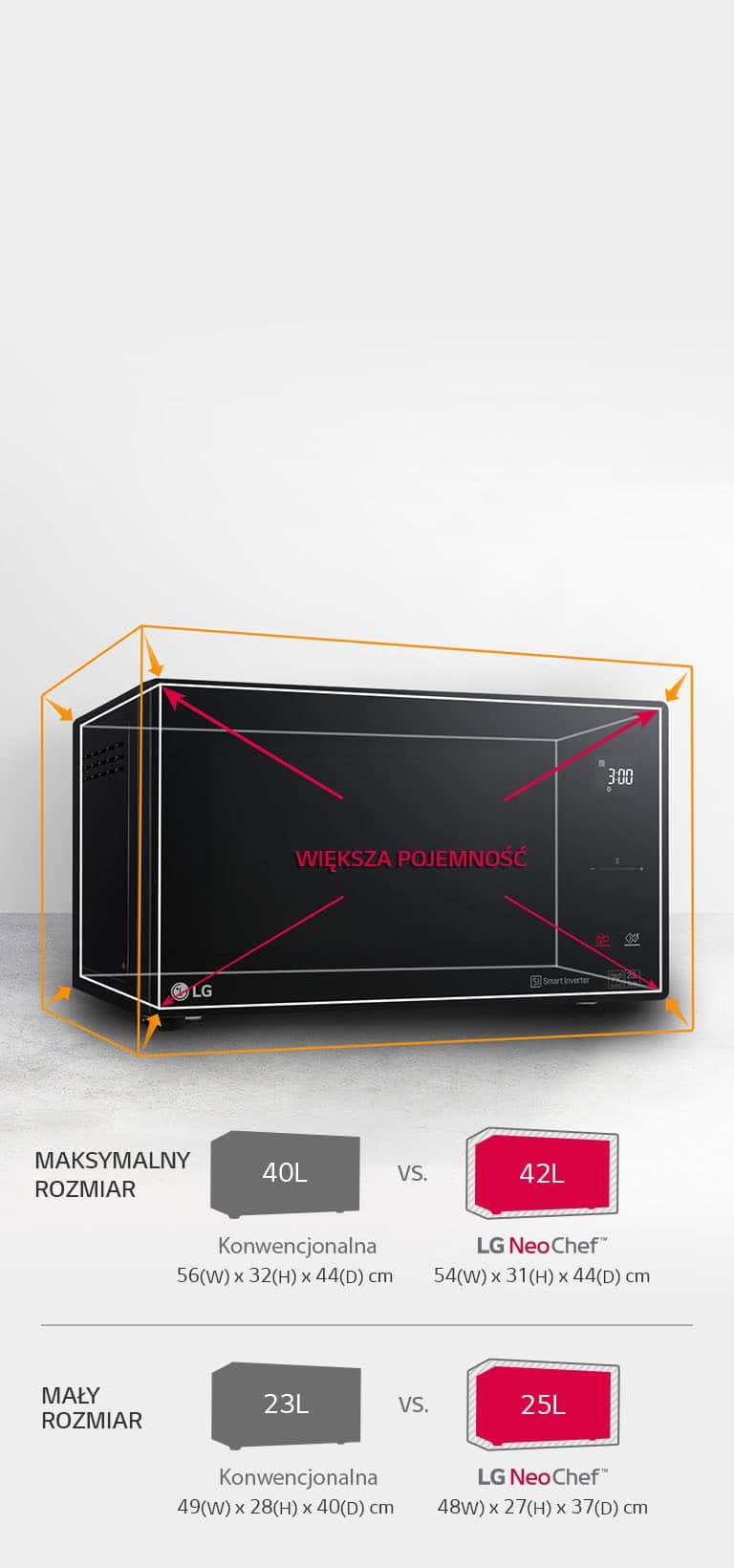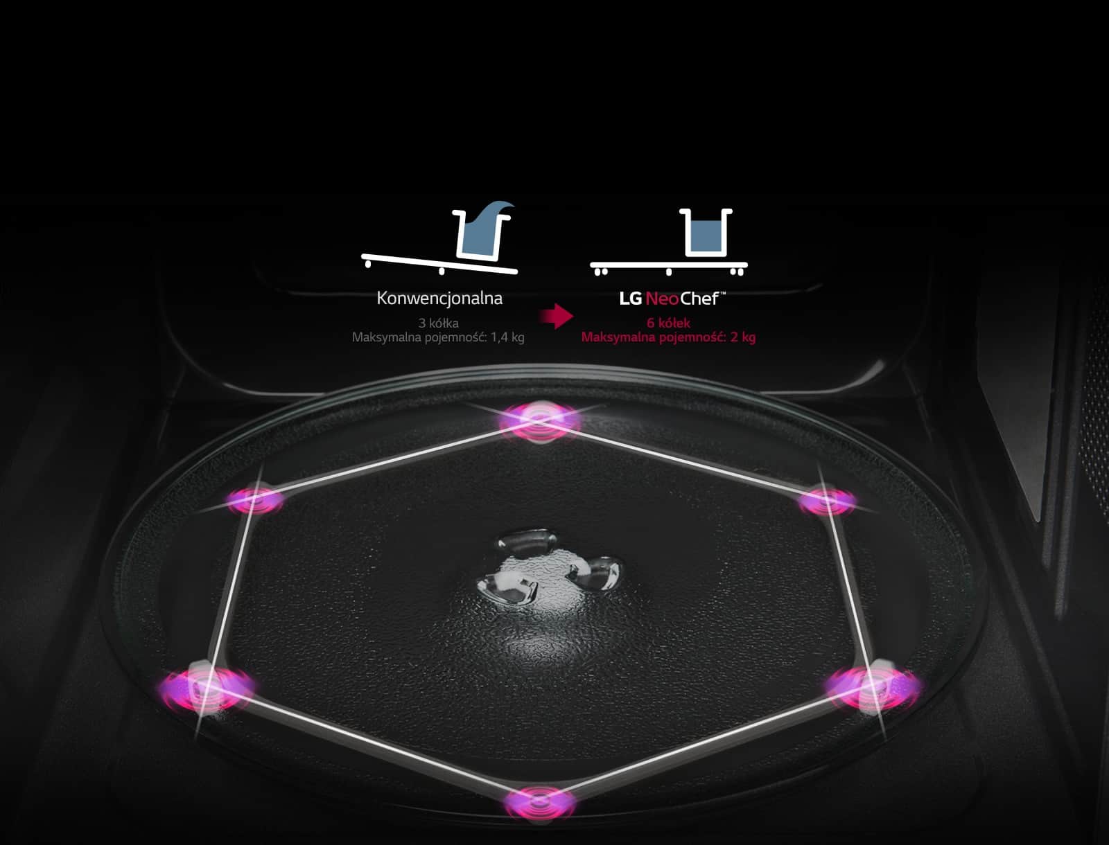 Нове покоління мікрохвильових печей NeoChefTM компактне, але має набагато більшу місткість. Завдяки невеликим зовнішнім розмірам плиту можна легко розмістити навіть на найменшій кухні, і при цьому вона легко вміщає високі та широкі тарілки.