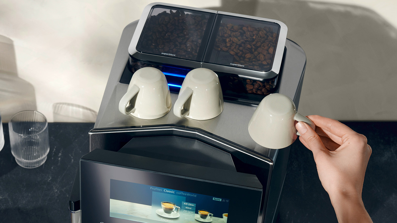 Завдяки технології superSilent щоразу, коли ви вмикаєте кавоварку, ви можете розслабитися в тиші та спокої, поки пристрій варить вашу каву. Вдосконалена конструкція пристрою включає оптимізовану акустичну ізоляцію та спеціальні ущільнювачі, які максимально зменшують звуки, що виходять від кавомашини під час роботи.
