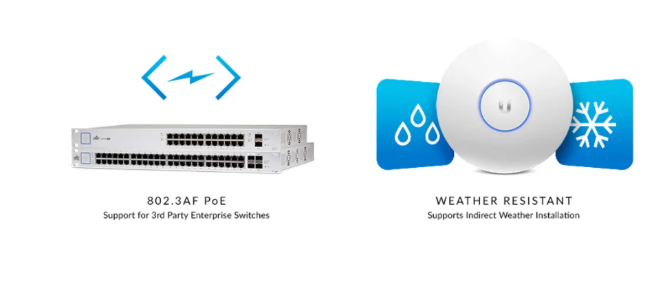 UniFi AP AC PRO має два гігабітні порти з підтримкою PoE 802.2af. Корпус, стійкий до мінливих погодних умов, дозволяє працювати приладу як у приміщенні, так і на вулиці.