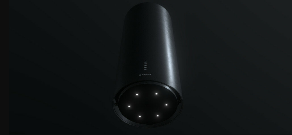 Ціліндр Isola пропонує передові технології Faber, які забезпечують комфорт і чисте повітря на кухні. Класична форма циліндра робить його ідеальним для острівних кухонь: розташований у самому центрі кімнати, його краще видно та милується. У його структуру інтегровані високотехнологічні функції: від панелі управління до функції інтенсивного поглинання, оптимізованих швидкостей і можливості за допомогою пульта дистанційного керування правильно регулювати роботу витяжки в приміщенні.