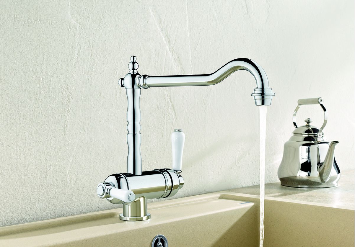 Трьохходові змішувачі, залежно від моделі, доступні у варіанті з окремим виливом фільтрованої води або із загальним виливом для фільтрованої та водопровідної води; цей вилив оснащений спеціальним регулятором потоку, який запобігає витоку води два джерела від змішування .