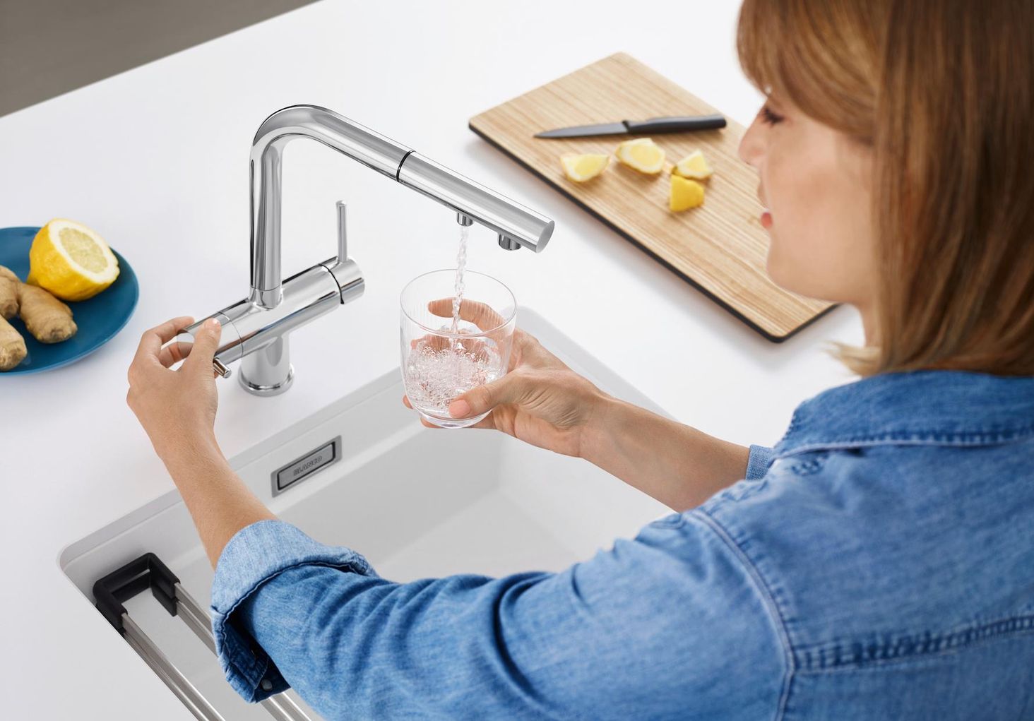 Чиста вода означає кращу якість життя. Змішувачі BLANCO з підключенням до фільтрованої води сприяють її збільшенню - в поєднанні з наявними в продажу системами фільтрації води, які встановлюються в тумбі під раковиною.