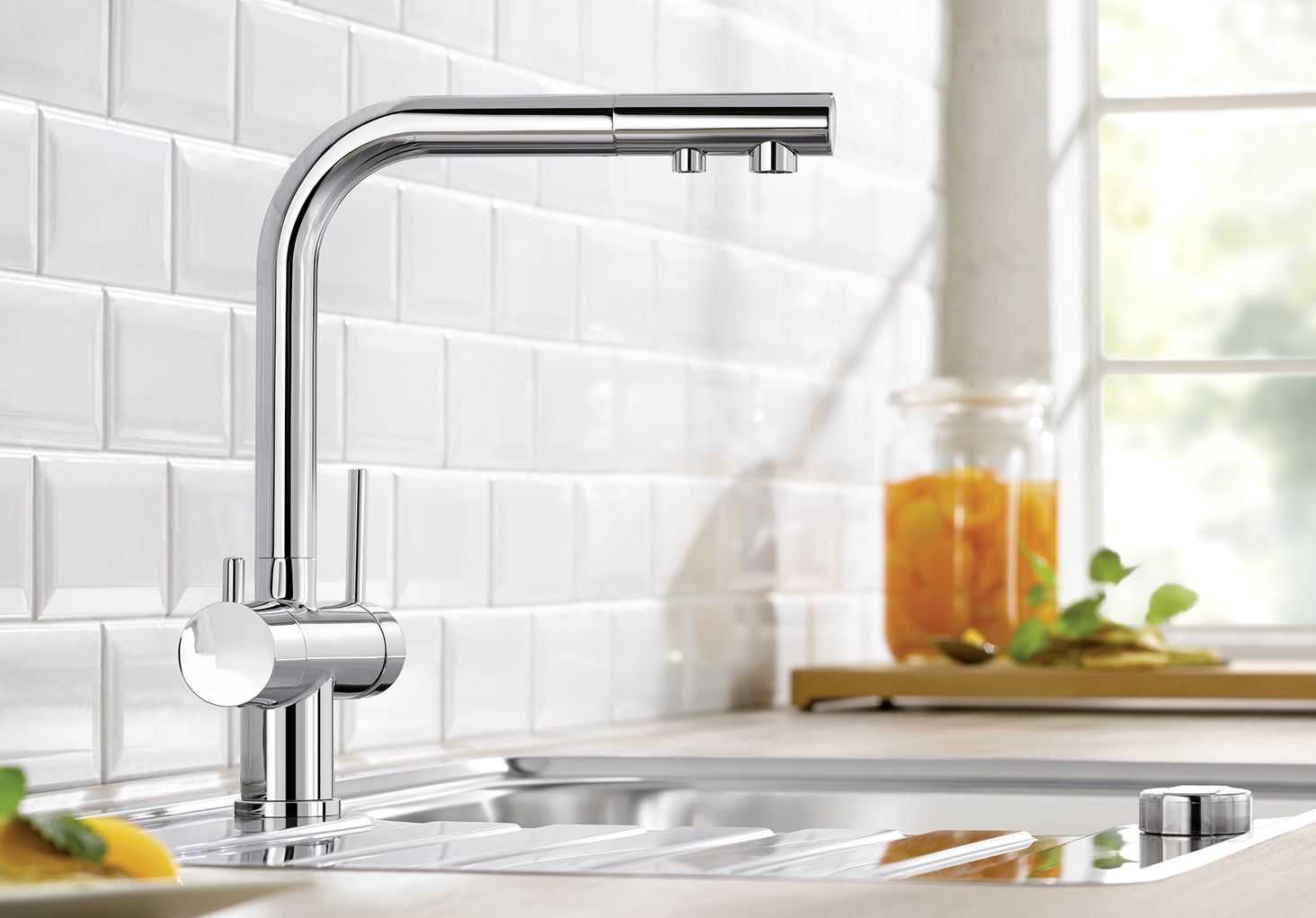 Змішувачі BLANCO з можливістю підключення до фільтрованої води управляються за допомогою окремих важелів, які активують подачу очищеної питної та водопровідної води.