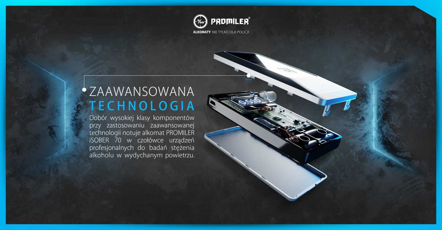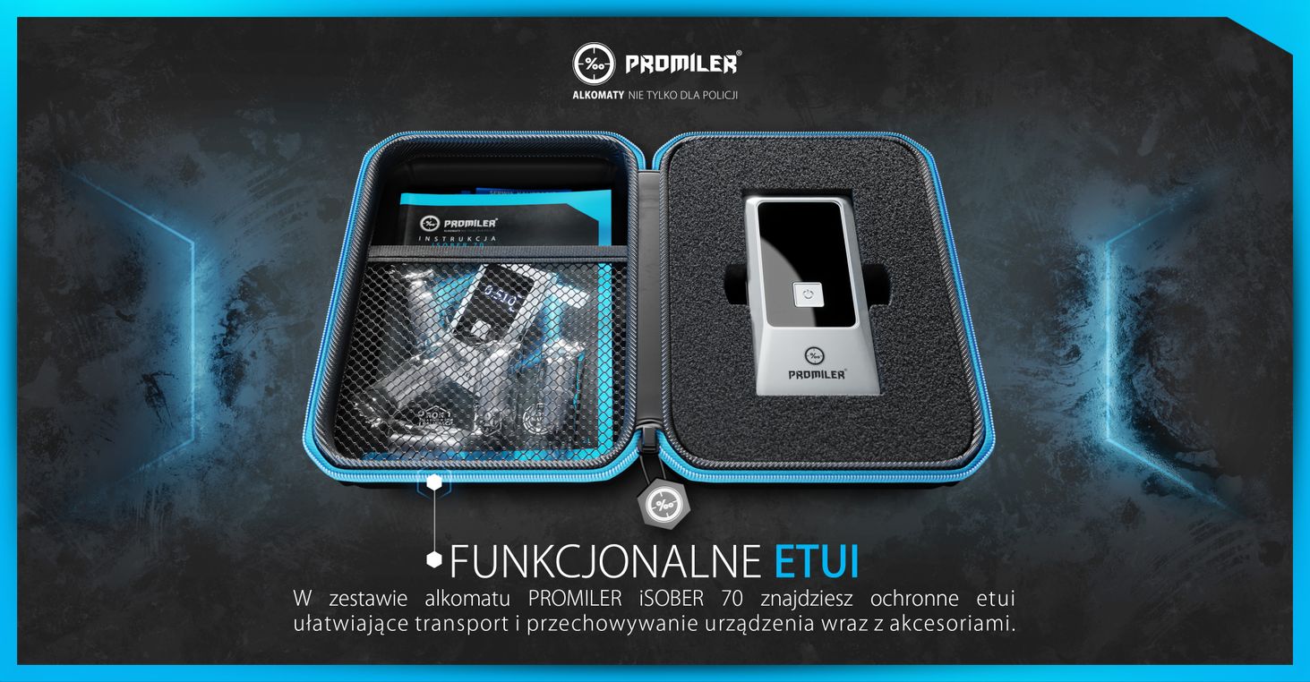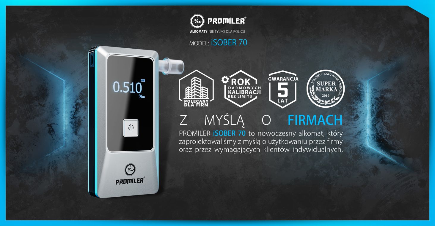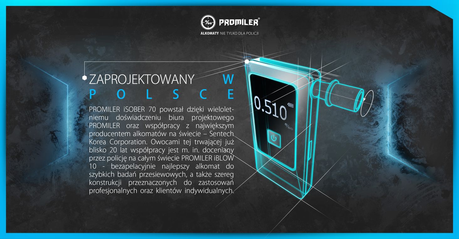 iSOBER 70 був створений в результаті співпраці нашого польського конструкторського бюро з найбільшим виробником алкотестерів у світі. Завдяки цьому платиновий датчик з надзвичайно великою активною поверхнею (більша довговічність і точність), що підтримується компонентами найвищої якості та широким програмним забезпеченням, укладено в невеликий акуратний корпус. Всі непотрібні в повсякденному використанні елементи сховані під кришкою акумулятора, завдяки чому збережено елегантну форму та інтуїтивно зрозуміле управління.