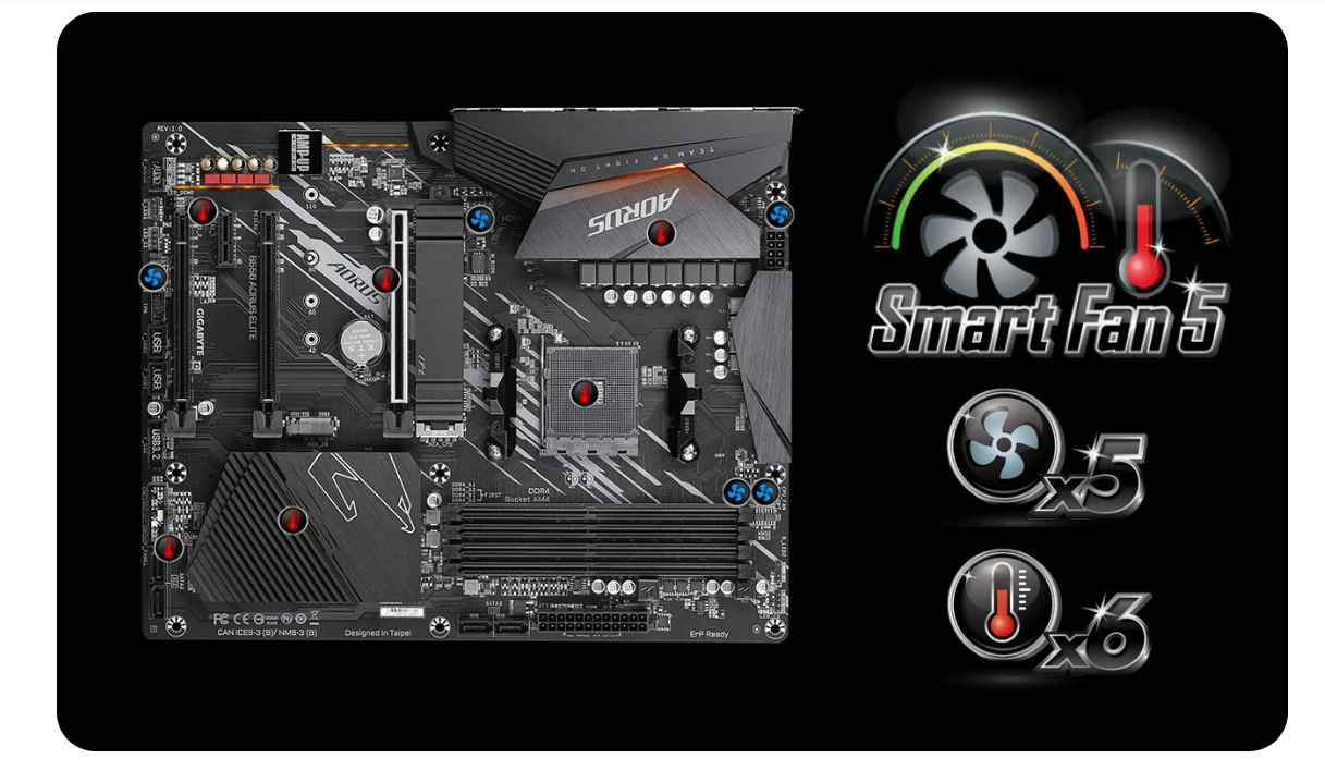 Як і багато материнських плат Gigabyte, B550 AORUS ELITE використовує технології Ultra Durable, такі як укріплений металом слот PCI-E. Материнська плата також має систему Smart Fan 5: набір із 6 датчиків температури та 5 роз’ємів вентиляторів, які дозволяють зберігати повний контроль над охолодженням комп’ютера. А температури секції твердотільного джерела живлення контролюються системою масивних радіаторів і багатошарової друкованої плати з додатковою порцією міді.