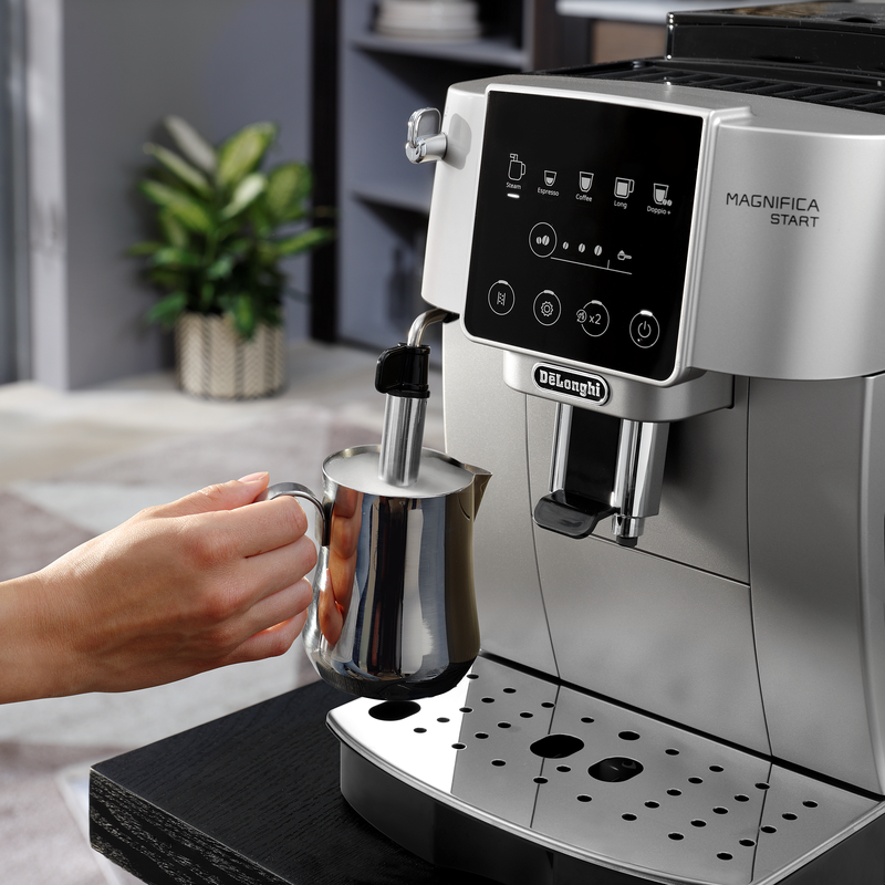 Magnifica Start De'Longhi — це стильна автоматична кавоварка, в якій одним дотиком кнопки можна приготувати ароматну чорну каву: еспресо, подвійний еспресо, каву, Doppio+ і лонг, а завдяки традиційній насадці для спінювання молока , для їх молочних варіантів можна приготувати легку піну або закип'ятити воду для чаю. Проста та інтуїтивно зрозуміла панель керування з персоналізованим вибором напоїв полегшує керування пристроєм. Ви можете використовувати як каву в зернах, так і мелену каву та регулювати інтенсивність напою відповідно до власних уподобань, варячи каву з сильним, середнім або ніжним ароматом. Обслуговування кавомашини також є зручним і безпроблемним. Знімну заварювальну групу можна легко підтримувати в чистоті, а стійкий до подряпин піддон зі знімною решіткою можна мити в посудомийній машині.