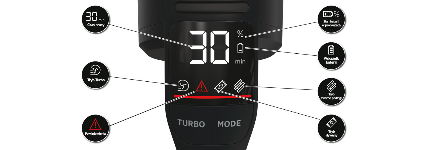 Сучасний дисплей пилососа - справжній центр управління всіма налаштуваннями пристрою. Дозволяє швидко визначити рівень заряду батареї, час роботи до розрядки батареї, дозволяє швидко вибрати режим пилососіння, а також постійно надсилає повідомлення, наприклад, про необхідність очищення фільтра.