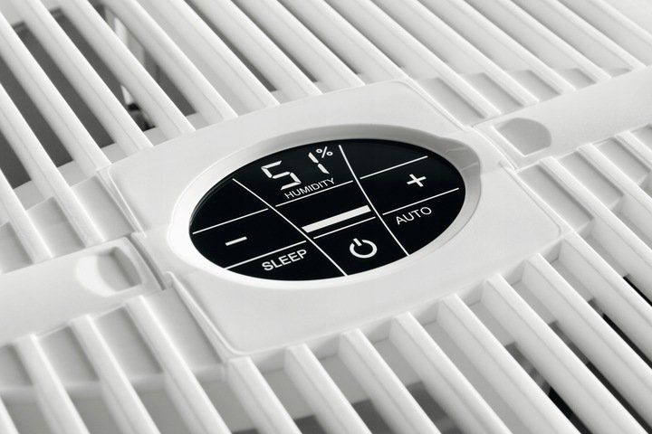 Просто торкніться значка, щоб увімкнути або вимкнути пристрій; Швидкість обертання регулюється кнопками з позначками «+» і «-». Airwasher Comfort Plus можна одним дотиком перемкнути в нічний режим, при якому яскравість дисплея і швидкість обертання знижуються до мінімуму (тоді пристрій практично не чутно), або автоматичний режим, який підлаштовує швидкість обертання під поточний рівень вологості. Завдяки цим рішенням керування пристроєм стає простою дитиною, а вбудований гігростат постійно відображає та контролює рівень вологості.