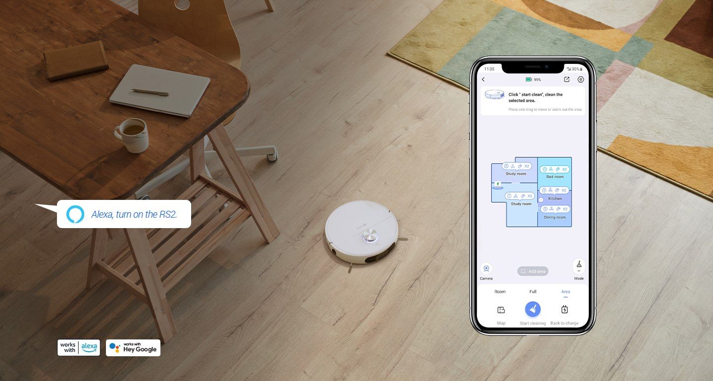 Додаток EZVIZ дозволяє вам планувати свій графік прибирання заздалегідь або починати прибирання негайно, навіть коли ви не вдома. Ви також можете клацнути будь-яку область на карті та перевірити її в режимі реального часу......або насолодитися голосовим керуванням за допомогою популярних голосових помічників і запустити RS2, просто сказавши "Hey Google" або "Alexa".