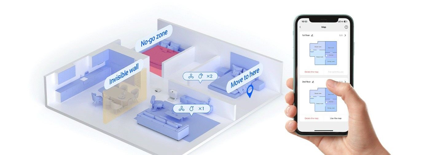 Завдяки передовим лазерним технологіям D-ToF і камерам RGB RS2 створює точну карту вашого дому. Ця інноваційна функція дозволяє налаштовувати карту та встановлювати конкретні місії очищення для певних областей. Навіть для великих будинків RS2 автоматично створює плани прибирання для різних поверхів, забезпечуючи оптимальне прибирання на кожному рівні.