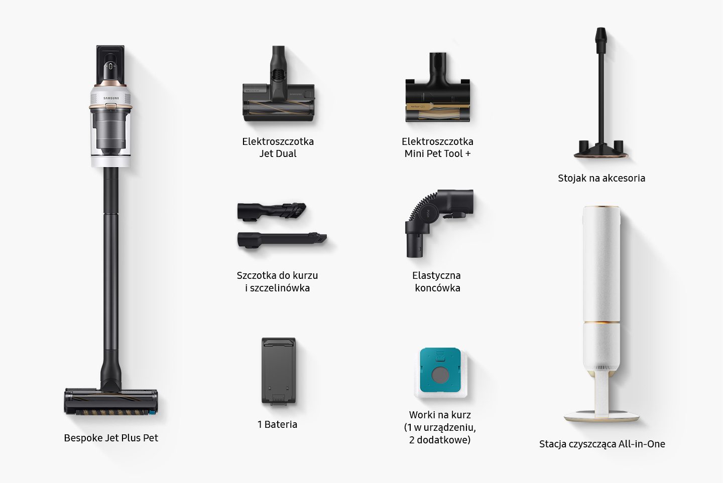 У комплекті з пилососом Bespoke Jet Plus pet VS20B95823W ви отримаєте: станцію для прибирання All-in-One, електричну щітку Jet Dual, Mini Pet Tool + електричну щітку для зменшення шерсті на диванах, гнучкий наконечник для прибирання важкодоступних - доступні місця, щілинний інструмент і щітка для пилу з висувною м’якою щетиною. Крім того, ми включаємо підставку для приладдя для пилососа. У комплект входить одна батарея¹⁷, завдяки якій пилосос може тривати до 60 хвилин.