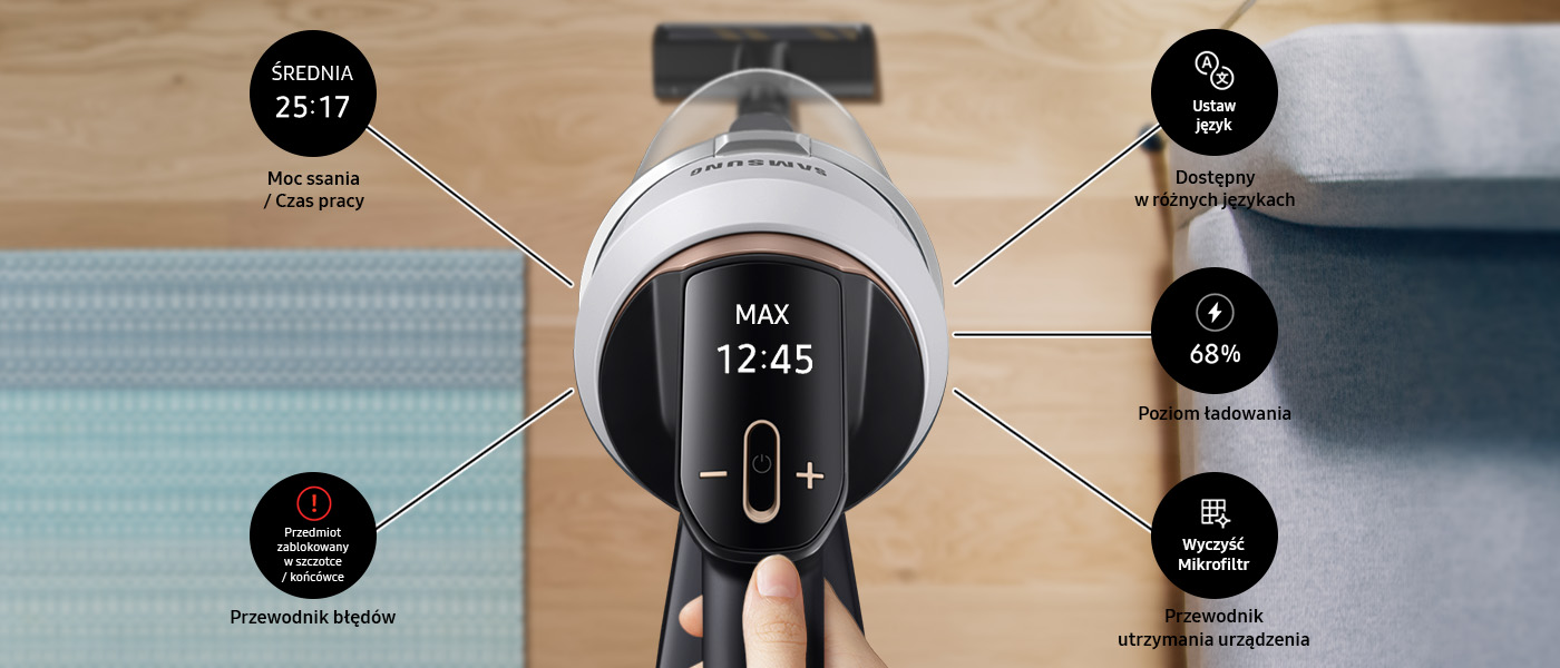 Інтуїтивно зрозуміле керування, використання та обслуговування пилососа за допомогою цифрового рідкокристалічного дисплея з меню польською мовою. Потужність всмоктування та час роботи акумулятора²¹ завжди під рукою. Пилосос попереджає про проблеми і пропонує рішення. Поки акумулятор заряджається, він показує рівень заряду.
