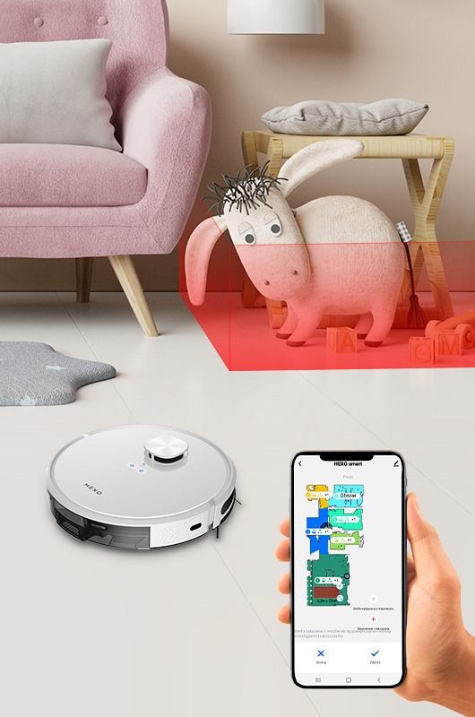 Розумний робот HEXO запам'ятовує розташування вашої квартири та зберігає її детальну карту. У додатку Smart Life ви розділите карту на кімнати і виберете, в якій кімнаті робот повинен почати прибирання. Ви можете будь-коли віддалено запустити робота та переглянути хід його роботи в додатку.